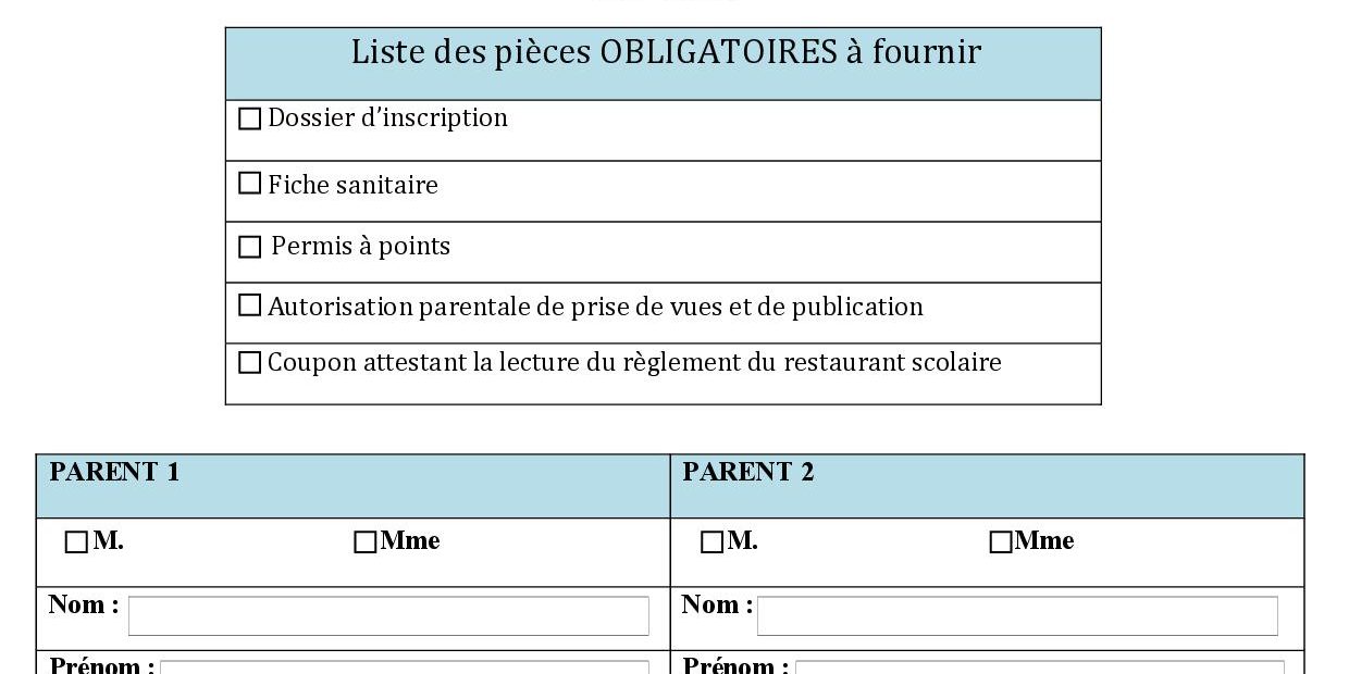 Ci-dessous les différents éléments du dossier à remplir. Vous pouvez nous transmettre les dossier par mail à aubigne.racan@wanadoo.fr